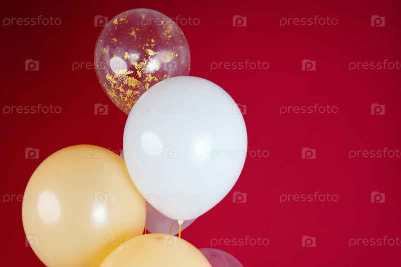 Светлые шары - белые, бежевые, прозрачные, перламутровые на красном фоне. Горизонтальное фото. Место для текста