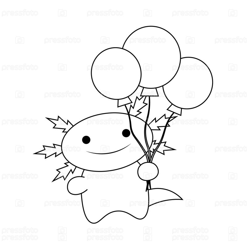 Милый мультяшный Аксолотль с гелиевым шаром в черно-белом цвете