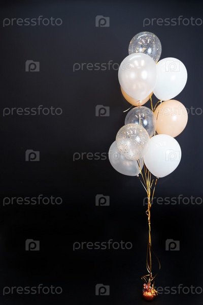На черном фоне летят воздушные шары светлых оттенков – белого, бежевого, прозрачного. Место для текста