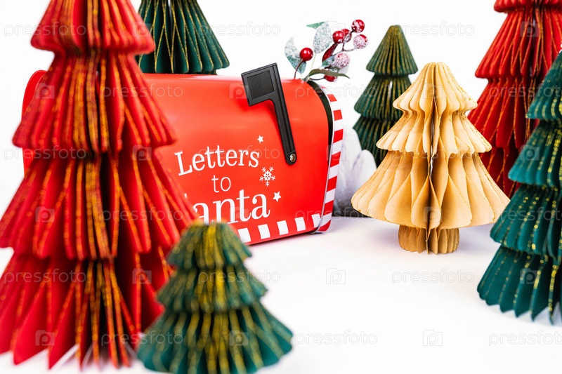 Новогодний фон для товара или открытки. Цветные елки, почтовый ящик Санта-Клауса