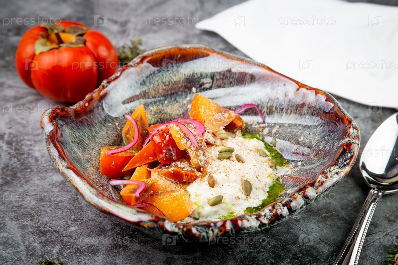 Вид сбоку на блюдо из запеченной хурмы, цветного перца, риса и семян