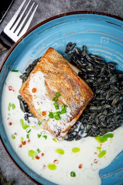 Черная фасоль со стейком из большой рыбы, зеленым луком и сливочным соусом, вид сверху