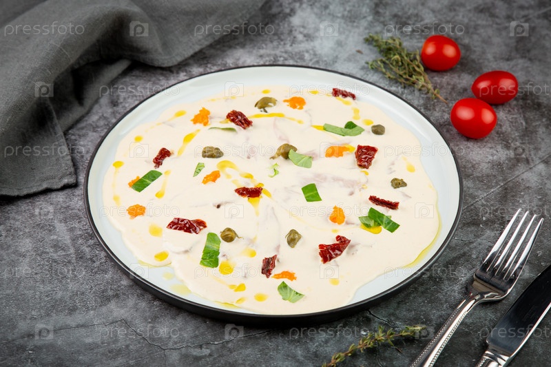 Йогурт с добавлением сиропа, сухофруктов и кусочков орехов, вид сверху