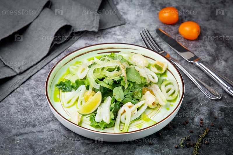Салат с рукколой, петрушкой, лаймом и кольцами кальмара, вид сбоку
