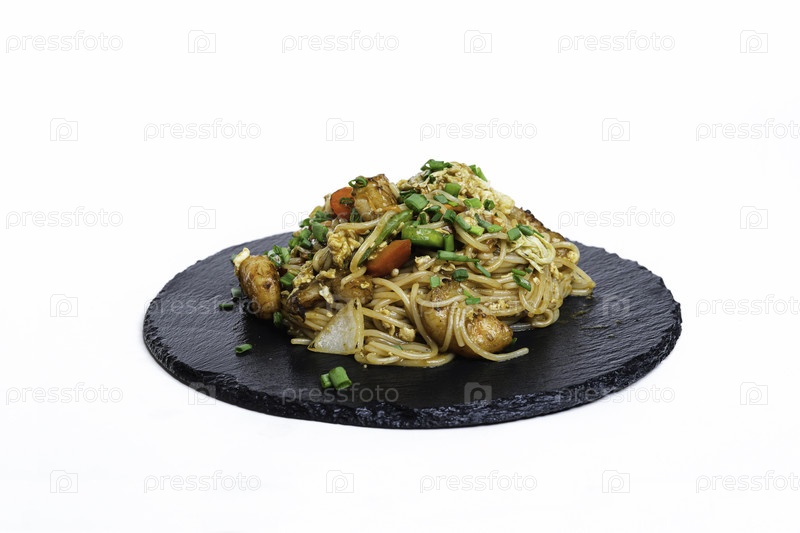 Жареная лапша с овощами и мясом в плоской тарелке на белом фоне, вид сбоку