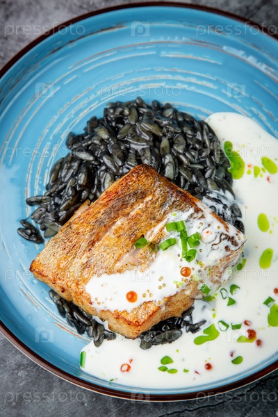 Черная фасоль со стейком из большой рыбы, зеленым луком и сливочным соусом, вид сверху
