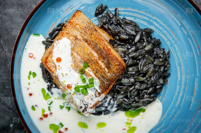 Черная фасоль со стейком из большой рыбы, зеленым луком и сливочным соусом, вид сверху