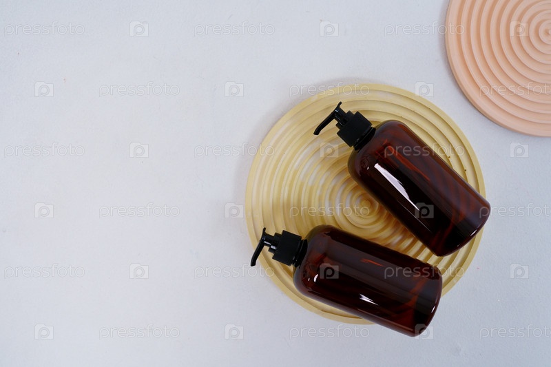 Две темные бутылки для шампуня или косметики на светлом фоне и круглые подставки. Вид сверху