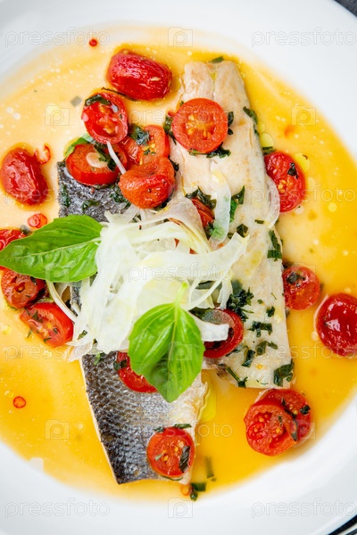 Неочищенная рыба с подливкой, зеленью, помидорами черри и луком, вид сверху