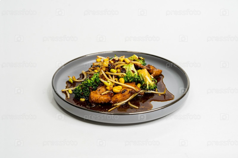 Жареное азиатское блюдо с кисло-сладким соусом, чесноком и овощами на тарелке, вид сбоку