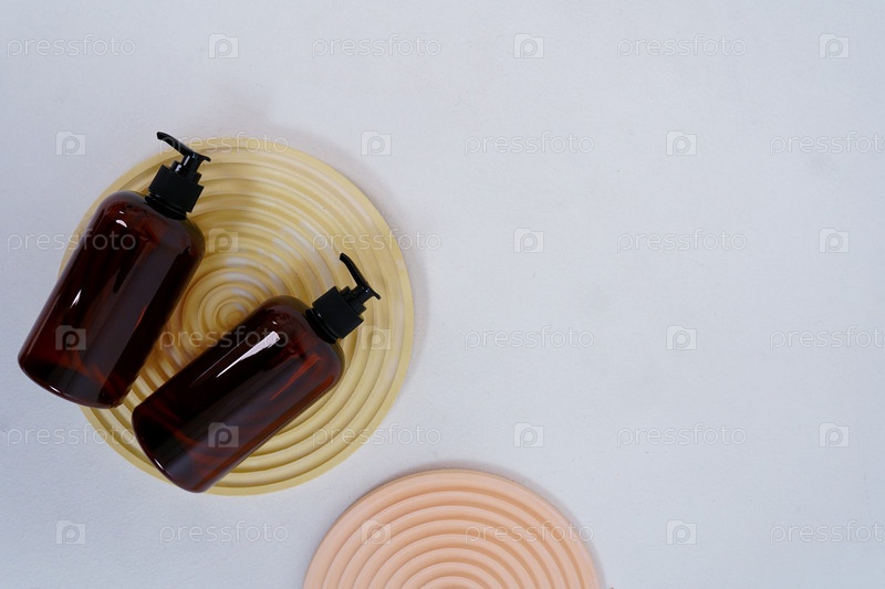 Две темные бутылки для шампуня или косметики на светлом фоне и круглые подставки. Вид сверху