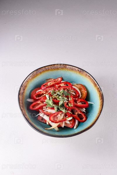 Красный сладкий перец с луком, помидорами и овощами в тарелке на белом фоне, вид сверху