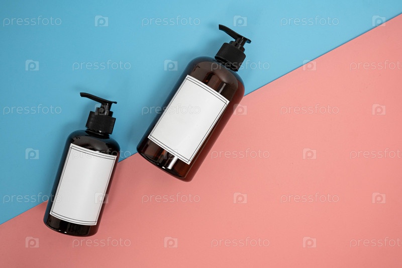 Уход за телом. набор бутылочек с дозаторами на синем и розовом фоне. Рекламная концепция