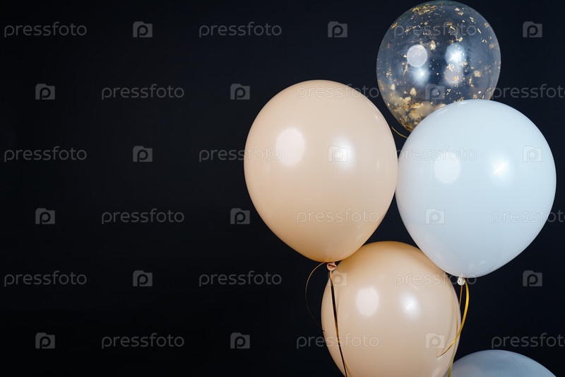 Букет из воздушных шаров белого, бежевого и прозрачного цветов на темном фоне. Место для надписи