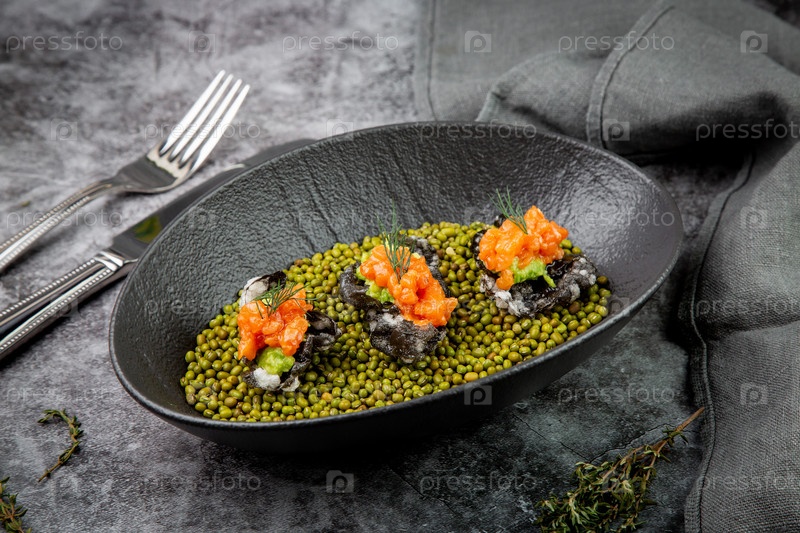 Черная икра, красная рыба и вассаби на тарелке с горошком, вид сверху
