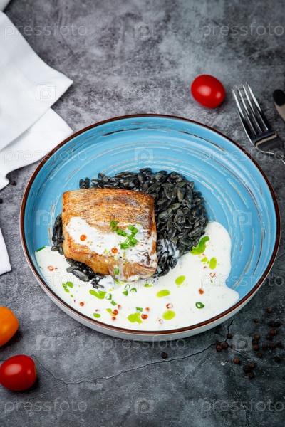 Черная фасоль со стейком из большой рыбы, зеленым луком и сливочным соусом, вид сверху