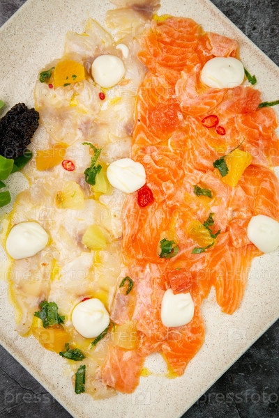 Нарезанная красная и белая рыба с сыром моцарелла и зеленью, вид сверху