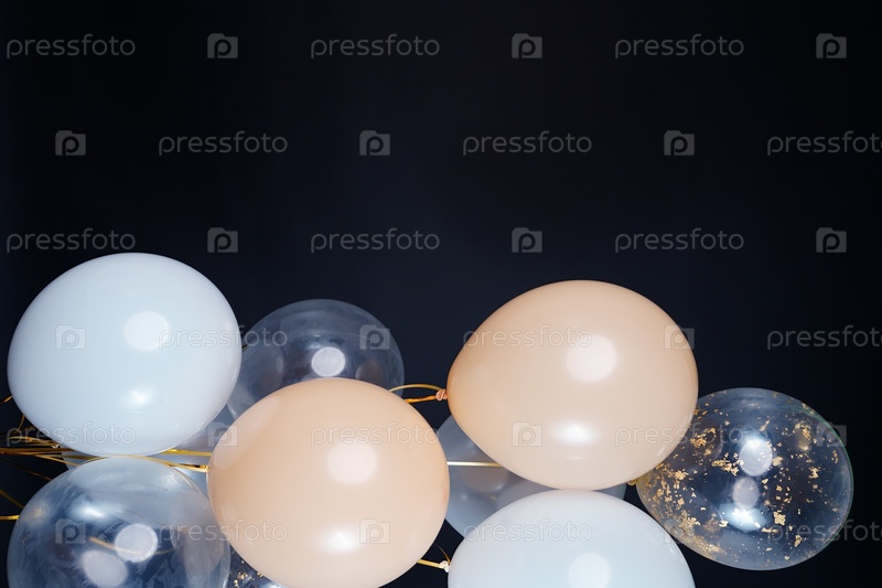 На черном фоне летят воздушные шары светлых оттенков – белого, бежевого, прозрачного. Место для текста