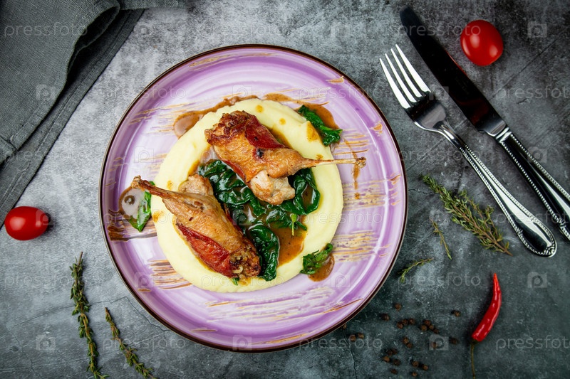 Запеченные куриные крылышки с соусом, шпинатом и картофельным пюре, вид сверху