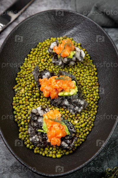 Черная икра, красная рыба и вассаби на тарелке с горошком, вид сверху