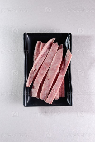 Нарезанное вареное мясо на черной тарелке на белом фоне, вид сверху