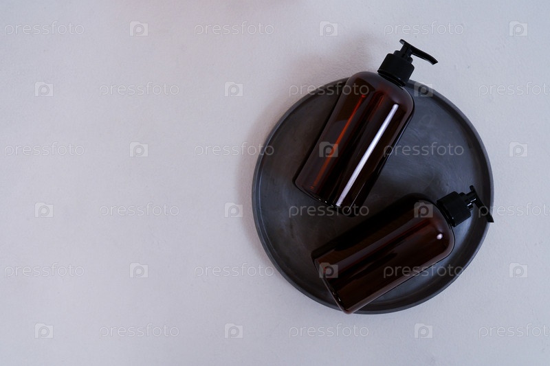 Композиция с геометрическими фигурами. Уход за телом. две бутылки с дозатором на черной тарелке на светло-сером фоне. Рекламная концепция