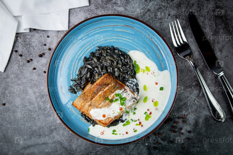 Черная фасоль со стейком из большой рыбы, зеленым луком и сливочным соусом, вид сверху