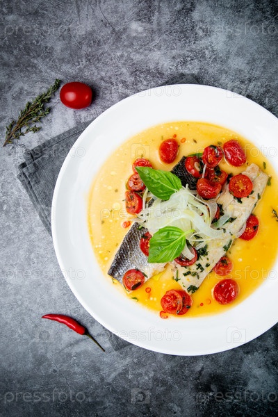 Неочищенная рыба с подливкой, зеленью, помидорами черри и луком, вид сверху