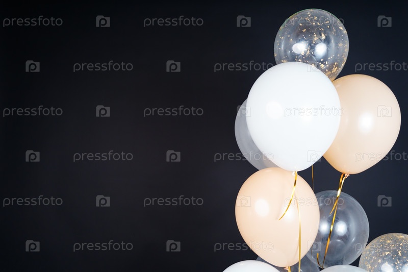 Букет из воздушных шаров белого, бежевого и прозрачного цветов на темном фоне. Место для надписи