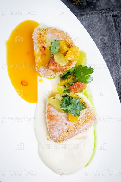 Рыбное филе в панировке с ананасом, петрушкой и сливочным соусом, вид сверху