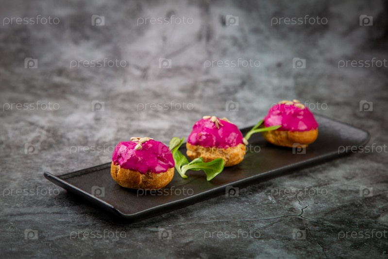 Десерт из запеченных булочек с малиновой начинкой и украшениями из семян, вид сбоку