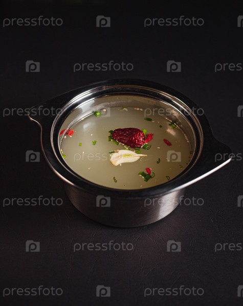 Суп-бульон в железной тарелке на темном фоне, вид сбоку