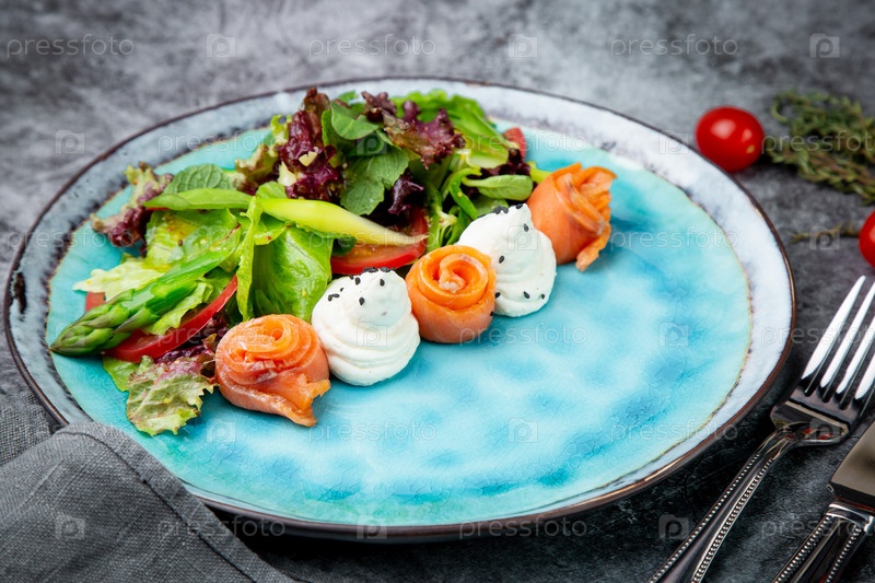 Салат из листьев разных видов салата и рыбных рулетов, вид сверху