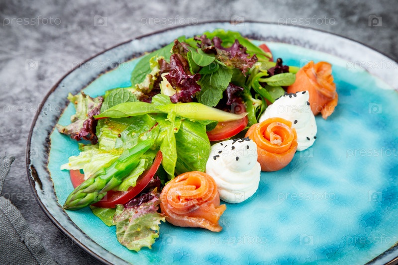 Салат из листьев разных видов салата и рыбных рулетов, вид сверху