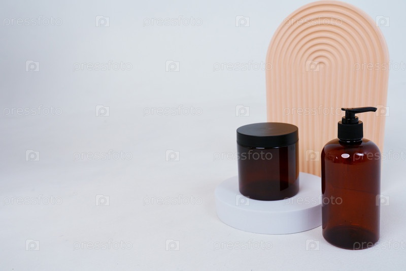 Композиция с геометрическими фигурами. Уход за телом. бутылка с дозатором и баночка с кремом на светло-сером фоне. Рекламная концепция