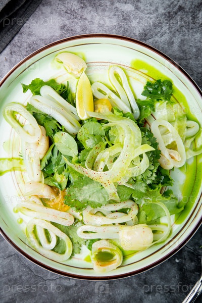 Салат с рукколой, петрушкой, лаймом и кольцами кальмара, вид сбоку