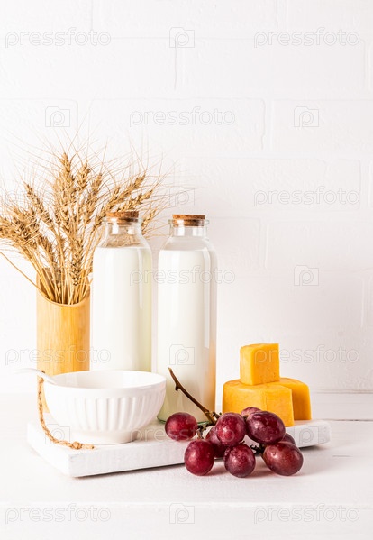 Красивый натюрморт к празднику еврейский Шавуот. Свежие молочные продукты, гроздь винограда и колосья хлеба на белом вертикальном фоне