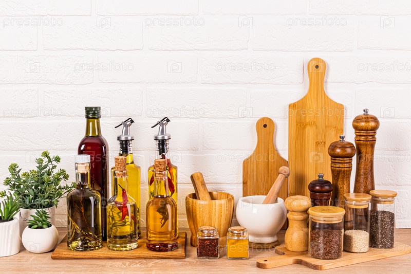 Стильный кухонный фон с набором бутылок с различными кулинарными маслами, стеклянными банками со специями, набором кухонных инструментов. Передний план