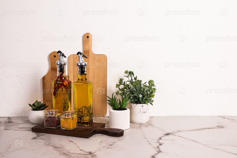 Красивый кухонный фон в светлых тонах в минималистском стиле. Две бутылки с дозатором масла и набор баночек для специй. Горшечные растения. Передний план