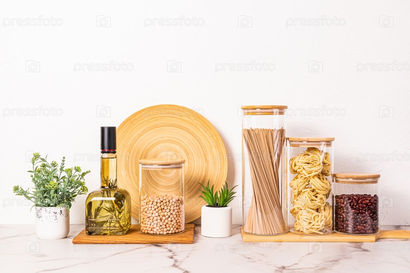 Красивый кухонный фон с набором банок для сыпучих продуктов, бутылкой масла на деревянных досках и мраморной столешницей. Передний план
