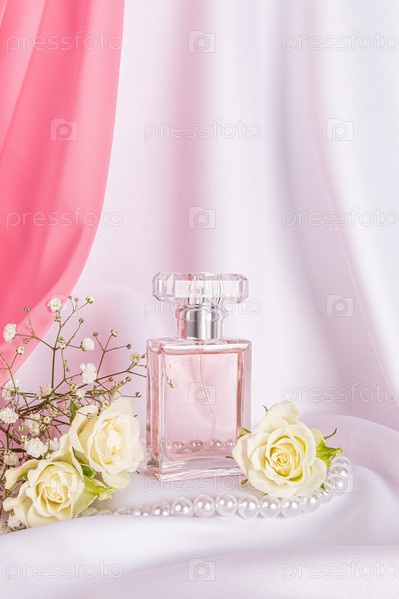 Стеклянный флакон духов на белом атласном фоне с розами и жемчужными бусинами. Модная концепция натуральных ароматов. Вертикальный вид