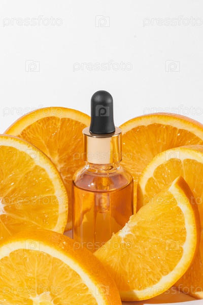 Экстракт сыворотки витамина С с нарезанными апельсинами на белом фоне. Натуральная косметика по уходу за кожей. Макет с копировальным пространством