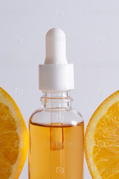 Натуральная сыворотка с витамином С, средства по уходу за кожей, продукты с эфирными маслами. Бутылка сыворотки с витамином С и свежими сочными оранжевыми фруктами. Макет брендинга косметической продукции