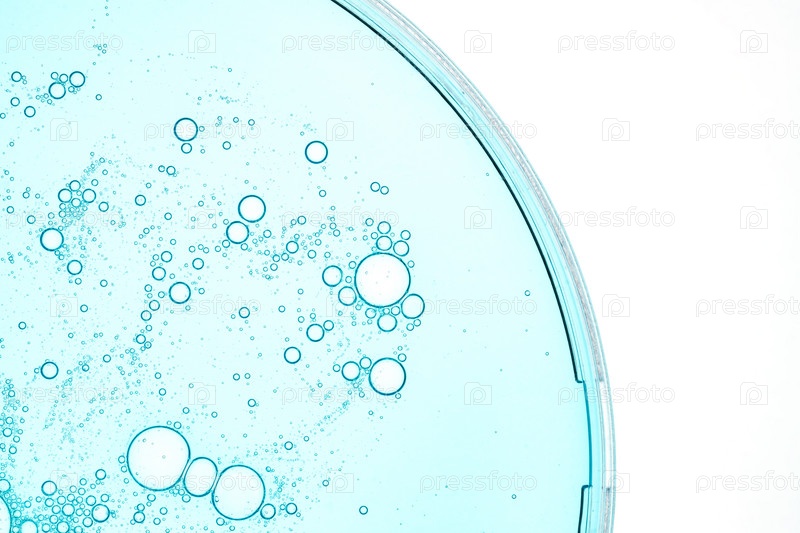 Абстрактная чашка Петри с косметической или медицинской жидкостью, изолированная на белом фоне, вид сверху с копировальным пространством. Концепция научной косметической лаборатории