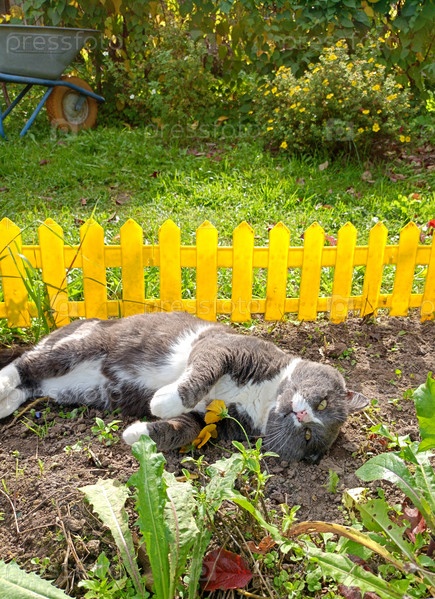Серый кот лежит на клумбе и с любопытством смотрит