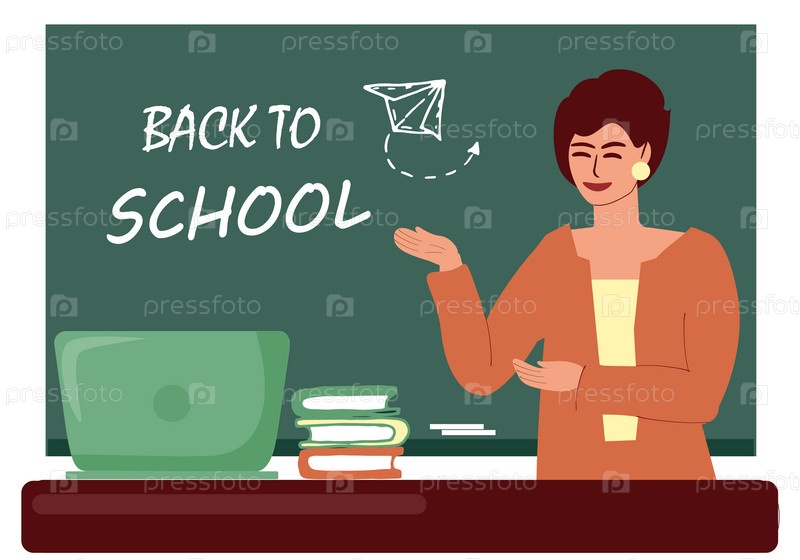 Учительница стоит у доски и стола с ноутбуком и книгами. На доске мелом надпись «Снова в школу». Образование, школа, учеба. Векторная цветная иллюстрация