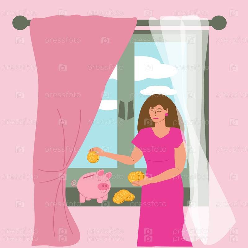 Молодая женщина кладет монеты в копилку, стоящую на подоконнике. Домашний учет, сбережения, семейный капитал, умножение денег, векторная цветная иллюстрация