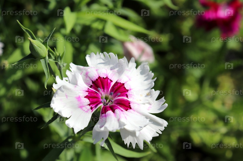 Белый и розовый цветок гвоздики с бутоном на клумбе