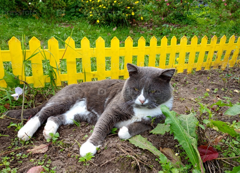Серый кот лежит на клумбе и серьезно смотрит в сторону