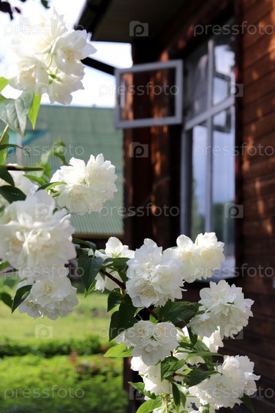 Ветка с белыми цветками чубушника оранжевого цвета